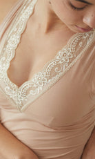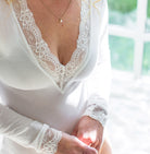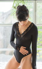 בגד הגוף במחשוף וי עמוק מעוטר בתחרה אירופאית עשירה (במחשוף ובקצות השרוול), בשילוב תיקתקים ללבישה במפשעה.